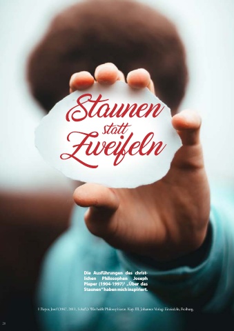 Die Ausführungen des christ- lichen Philosophen Joseph Pieper (1904-1997) „Über das 1 Staunen“ haben mich inspiriert. 1 Pieper, Josef (1947, 2011, 3.Aufl.): Was heißt Philosophieren. Kap. III, Johannes Verlag: Einsiedeln, Freiburg. 20